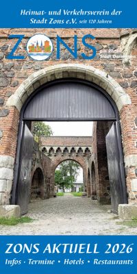 Alle Zonser Termine und Infos für das Jahr 2026 gibt es wieder in unserer neuen, kostenlos erhältlichen HVV-Veranstaltungsinfo "Zons Aktuell 2026". Die Infobroschüre gibt es in der Zonser Touristinfo, in den Zonser Gastronomiebetrieben und Geschäften und auch in Dormagen (Bürgeramt, Kulturbüro, Stadtbibliothek). Die 48-seitige Broschüre mit allen Zonser Terminen für 2026 enthält auch das aktuelle Hotel-, Zimmer- und Restaurantverzeichnis sowie 8 interessante Seiten zur Zonser Geschichte, ergänzt mit historischen Fotos und einem Lageplan von Zons um 1650. Auf Wunsch gerne auch per Versand (Mail an Diese E-Mail-Adresse ist vor Spambots geschützt! Zur Anzeige muss JavaScript eingeschaltet sein.) und hier auf der Webseite unter "News" als kostenloser Download. Wir freuen uns auf Ihren Besuch in unserer mittelalterlichen Zollfeste Zons am Rhein.